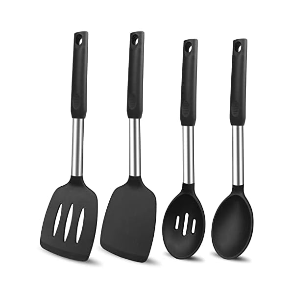 Silicone Cooking Spatulas and Spoons, 4 Pack Heat Resistant Silicone Cooking Utensils Set, Non Stick Large Kitchen Silicone Spatula and Spoons for Cooking, Mixing, Serving, Draining, Black