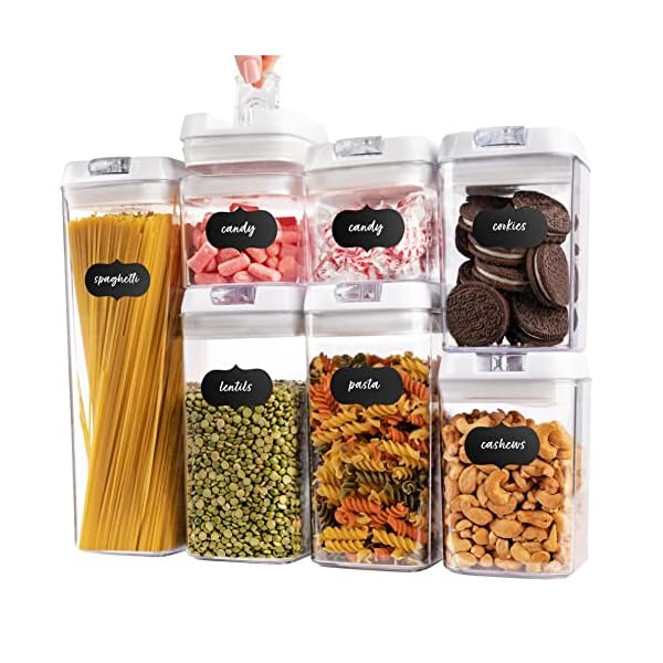 Airtight Food Storage Containers – Clear Plastic, Lid Lock, Reusable Stickers, Various Sizes, BPA Free. Perfect Dry Food Storage Organization for Kitchen and Pantry. (Set of 7)