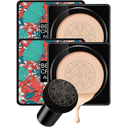 Amazfly Air Cushion CC Cream Mushroom Head Foundation, Moisturizing BB Cream Makeup Long Lasting Matte Concealer Bright Makeup Base Long Lasting with Mushroom Makeup Sponge (2PCS Natural)
