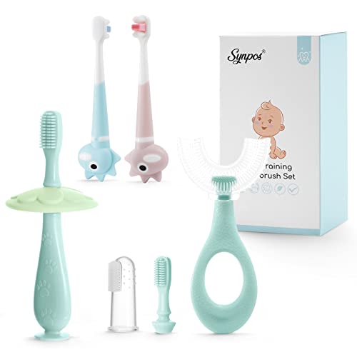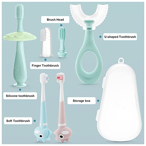 SYNPOS 7 in 1 Baby Infant Toothbrush Set Toddler Finger U-Shaped Toothbrush 360° Oral Care Training Tooth Brush for Child Food Grade Silicone, Extra Soft Bristles