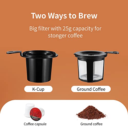 TWO IN ONE FUNCTION—— One machine for two purposes,If you like ground coffee or tea, you can choose to use reusable filter.If you like to use k cup capsule ,you can choose to use k cup holder.