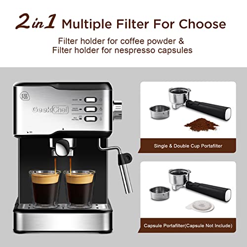 Geek Chef Espresso Machine Coffee Machine 20 Bar Pump Cappuccino latte Maker with ESE POD capsules filter&Milk Frother Steam Wand, 1.5L Water Tank, for Home Barista, Stainless steel 950W