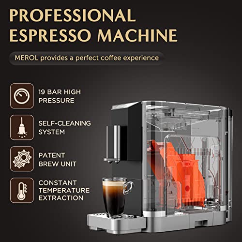 MEROL Super Automatic Espresso Coffee Machine, 19 Bar Barista Pump Coffee Maker with Adjustable Grinder, Touch Screen, Silver