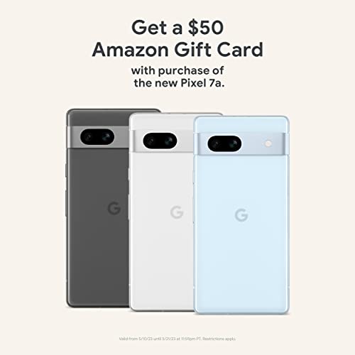Order the new Google Pixel 7a today and get a $50 Amazon Gift Card on us. Valid 5/10/2023 until 5/21/2023 at 11:59pm PT, while supplies last and subject to availability.