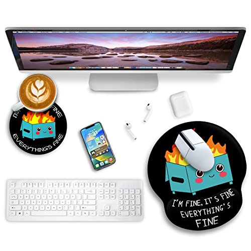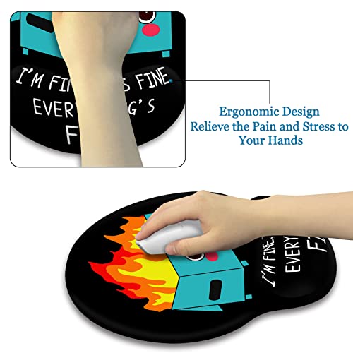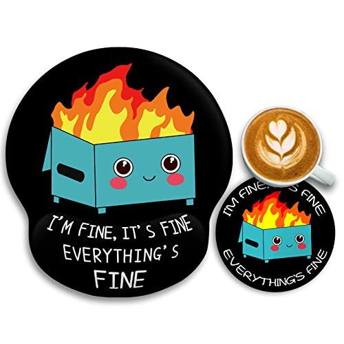 Ergonomic Mouse Pad Wrist Support and Coffee Coaster Non-Slip, Cute Dumpster Fire Gaming Mousepad with Wrist Rest, Pain Relief PU Base Mouse Mat for Laptop Computer Home Office Decor It’s Fine I`m Fine