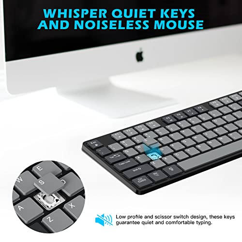 【Ultra-Thin Silent Wireless Keyboard and Mouse】 — Wireless keyboard is in a compact size and is lightweight and full sized design, , save space and be easy to carry. Standard QWERTY layout computer keyboard with num lock/caps lock/power indicator. Individual number pad, arrow keys etc helps you get more work done. Advanced scissor switch whisper-quiet keys design and silent click mouse.