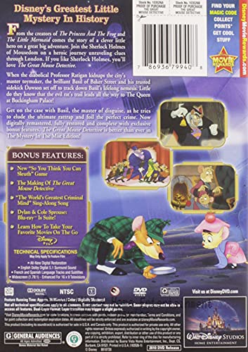 From the creators of THE PRINCESS AND THE FROG and THE LITTLE MERMAID comes the story of a clever little hero on a great big adventure. Join the Sherlock Holmes of Mousedom on a heroic journey unraveling clues through London. If you like Sherlock Holmes, you’ll love THE GREAT MOUSE DETECTIVE. When the diabolical Professor Ratigan kidnaps the city’s master toymaker, the brilliant Basil of Baker Street and his trusted sidekick Dawson set off to track down Basil’s lifelong nemesis. Little do they know that the evil rat’s trail leads all the way to The Queen at Buckingham Palace! Get on the case with Basil, the master of disguise, as he tries to elude the ultimate rattrap and foil the perfect crime. Now digitally remastered, fully restored and complete with exclusive bonus features, THE GREAT MOUSE DETECTIVE is better than ever in the Mystery In The Mist Edition!|After a four-year period of story development, animation took just over one year to complete. This remarkably short production span was possible due to new efficiencies in the production process (such as video tests and computer-assisted layouts and graphics), and an increased emphasis on story development prior to the start of production.|The score was written by composer Henry Mancini, who also collaborated on two of the three featured songs. The third song, “Let Me Be Good To You,” was written and performed by Melissa Manchester.|One hundred and twenty five artists were involved in making the film.|An innovative application of computer technology can be seen in the climactic scene where Basil faces Ratigan in a final confrontation inside the turning and thrashing gearworks of Big Ben. The 54 moving gears, winches, ratchets, beams, and pulleys were literally drawn by the computer and create a unique background for the characters, who had been animated in the usual way.