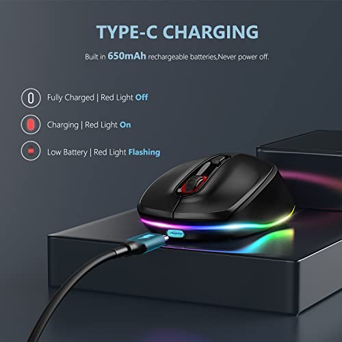 【Rechargeable Cordless Mouse】With a 650mAh battery, this rechargeable wireless mouse can last 7-10 days (with light). The charging port is a type-C port, so the cute mouse is a great companion for your laptop, Mac, etc.