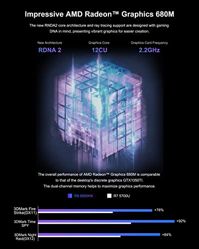 [AMD Radeon 680M GPU] Equipped with AMD Radeon 680M Graphics which built on the latest RDNA 2 architecture, better than Iris Xe and VEGA 8, support up to 60Hz 8K, brings ultra-high frame rate experiences and capable of running almost 3A games smoothly.