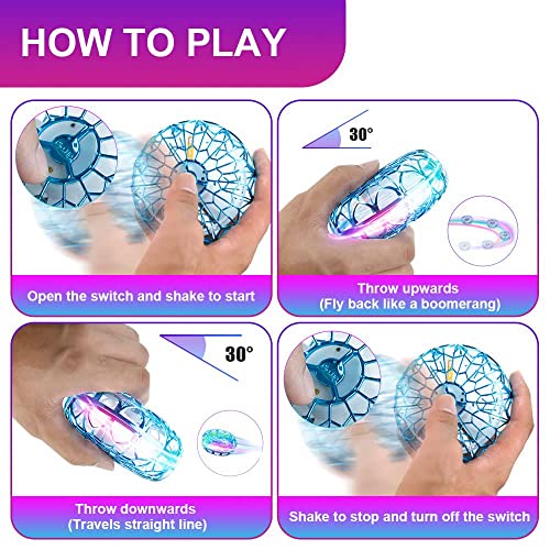 Easy to Play – Throwing out, different throwing speeds and angles of the flying ball allow different flight paths. Hand-controlled and the simple operation of this flying ball toys can be mastered quickly by adults and children.
