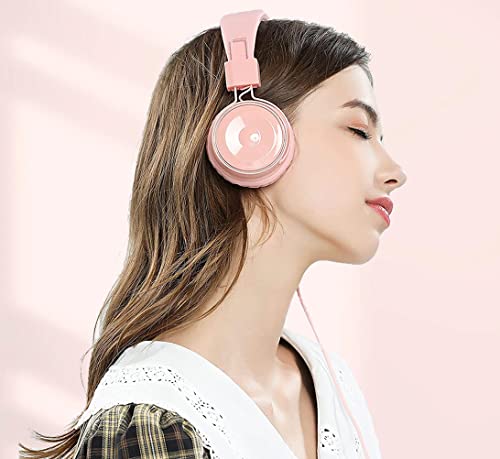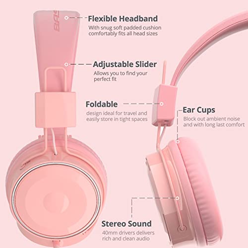 BASEMAN Wired Headphones with Microphone – Foldable Wired On-Ear Headphones for Laptops Computer Cellphone Tablet, Stereo Bass Headsets with 3.5mm Jack No-Tangle Cord for Boys Girls Women – Pink