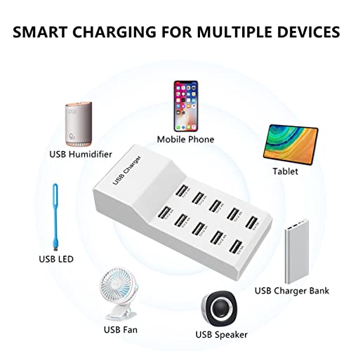 【Smart and Advantage】: Each port of the USB charging station can identify the exact current requirement of the connected device and provide the right amount of current to ensure safe and fast charging. More efficient than other similar products. 【Safe and Reliable】:USB wall charger built-in safety guards can protect your device from excessive current, overheating and overcharging. 【Multi Compatible】:10 USB ports multiple device charging station.Multi USB power charging hub is compact for most USB devices.USB charging station is compatible with smart phones,tablets,bluetooth speakers,headphones,cameras,USB fans,power bank etc. 【Convenient and Portability】: With a 5 feet power cord and 10 USB charger ports, it provides a convenient method for power distribution in bench and floor-standing applications. Perfect for multi-person scenarios such as home, office, party, school classroom, travel, etc. 【100% MONEY BACK GUARANTEE】: If you are not satisfied with our USB charging station,let us know and you will be offered a full refund or replacement. Enjoy this absolutely RISK FREE purchase by clicking the yellow Add to Cart button.
