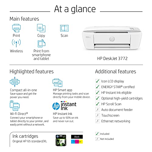 Introducing the HP DeskJet 3772, the perfect wireless printer for all your home and office needs. This all-in-one printer is designed to provide exceptional performance in a compact and stylish design. With its easy-to-use features, the HP DeskJet 3772 is the ideal choice for those looking for a printer that offers convenience, efficiency, and versatility. Compatible with a wide range of devices, including smartphones, tablets, and laptops, this printer is perfect for home use, small offices, or even dorm rooms. With its built-in Wi-Fi and Bluetooth capabilities, you can effortlessly connect to your devices and print from anywhere in your home or office.
