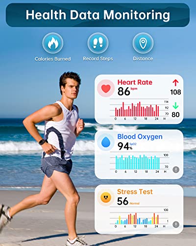 All-Day Health Tracking & Sleep Monitoring – The fitness watch has a built-in high-precision PPG optical sensor that tracks your heart rate, SpO2 blood oxygen, and stress 24 hours a day, giving you a primer on your health status. The sleep function monitors sleep quality through 3 stages: Awake, Light sleep and Deep sleep. It can help you improve your sleep time and provide effective advice. This fitness tracker also has features such as sedentary reminders and water reminders.