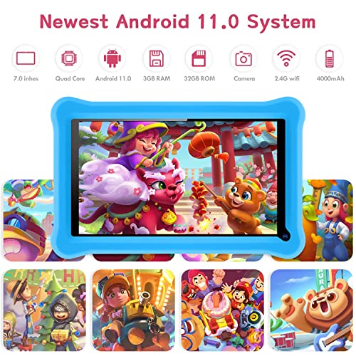 Kids Tablet 7 inch Android 11 Tablet for Kids(Ages2-5),RAM 3GB ROM 32GB(128GB Expand), Kids Software Pre-Installed, Google Certified Tablet,Dual Camera, Bluetooth, WiFi with Shockproof case-Blue