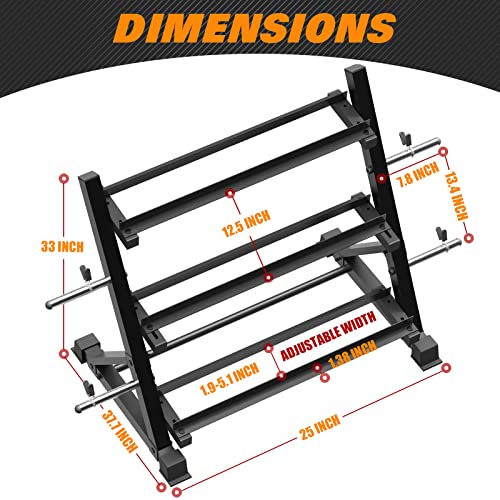 ?【WIDTH ADJUSTMENT RAILS】 Featuring in fitting different size dumbbell and weights, every tier of this weight holder has 4 screw holes and 2 rail width adjusters which allow adjusting the rail width from 1.97″ to 5.12″. So it can hold both bigger dumbbells and smaller dumbbells then you rest assured that your workout gear can be sorted and organized in an efficient way.