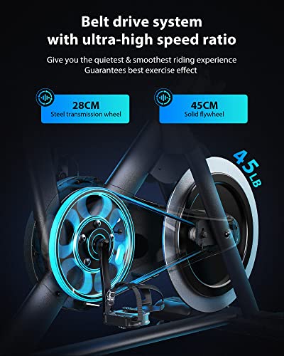 【High Speed Ratio】The Niceday stationary bike features a 45LBS solid flywheel. The 45CM diameter provides a higher speed ratio, and guarantees an excellent exercise effect and riding experience.