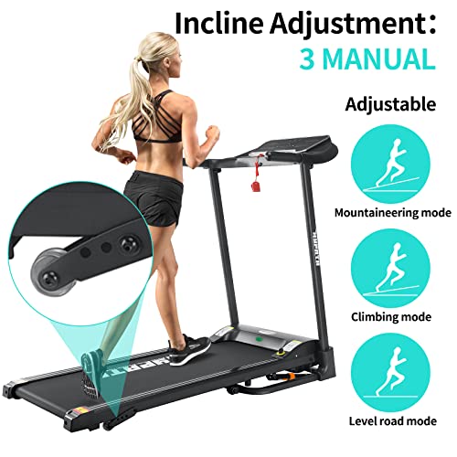3 Gear Adjustable Incline : You can manually adjust the incline between 3 levels to meet your different running intensifies, giving you a super-intense workout that really works your leg muscles. A higher incline means burning more calories! A level 3 manual incline treadmill makes for more challenging training and is suitable for running, walking and other levels of exercise at home.