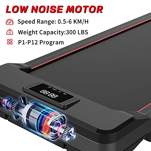 EASY TO MOVE AND STORE & TRANSPORT WHEELS: Featuring a space-saving design, the treadmill is only 5″” thick. With the built-in wheels it is easy to place the treadmill under your work desk, bed or sofa to make your home more tidy.