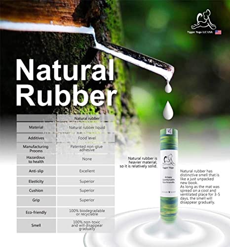 Tigger Yoga LLC – Yoga Mat – 100% Eco Friendly and Made from Natural Tree Rubber. Ultimate Catch Grip for Superior Traction, Dense Cushioning for Support and Stability in All Types of Yoga, Pilates, Meditation, Gym and General Fitness. ECO-FRIENDLY 100% natural rubber, biodegradable, no PVCs, no toxic chemicals. Made with non-toxic foaming agents and non—AZO dyes. SUPERIOR QUALITY, COMFORT, AND SUPPORT Tigger Yoga uses the highest quality materials available to deliver outstanding performance. At 4mm thick, Tigger Yoga mat is firm and provides unrivaled cushioning, stability and support for kneeling postures. EXCELLENT GRIP & SLIP RESISTANT Our 100% natural rubber Tigger Yoga mat features an outstanding ripple surface texture for superior traction and catch grip to increase stability and prevent slipping. It performs brilliantly in any style yoga, even in the most dynamic and sweaty of environments. THE ONLY MAT YOU NEED At 72” x 24” and 4mm thick, the 100% natural rubber Tigger Yoga mat is suitable for all types of floor activities, including yoga, pilates, stretching, meditation, and general fitness. It is the most popular size on the market and the most durable yoga mat available. EASY CARE Simply wipe down your Tigger Yoga mat with any vinegar base solution and air-dry. Store in a cool, dry place and avoid direct sunlight. Instructions for care and use : ? Before using : All natural rubber has distinctive smell that is like a just unpacked new book. as long as the mat was spread on a cool and ventilated place for 3-4 days , the smell will disappear gradually. ? To clean : This mat is not washable , simply wipe down with vinegar and water mixed solution (ratio 1:20) and air -dry. ? To store : Clean and dry before storing and keep in a cool dry place . Avoid direct sun exposure . ✨ Product color may slightly vary due to photographic lighting sources or your monitor settings.