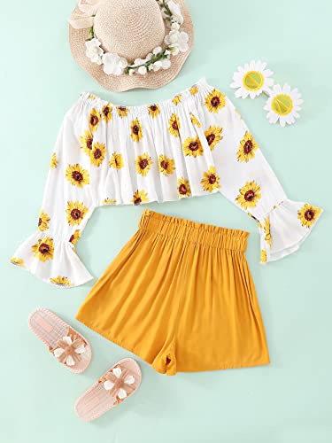 Features: Floral print, off the shoulder, long sleeve, flounce sleeve, paper bag waist, elastic waist shorts, fashionable