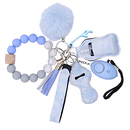 [Stylish & Practical Keychain Wristlet Set]: The safety keychains full set is made of food-grade silicone material and natural hexagonal wood beads. Cute pompoms and stylish lipstick holder will make you love it. Wristlet keychain set comes with Wristlet, Pom Pom, Chapstick Holder, Personal Alarm, Bottle Opener, Hand Sanitizer Holder, 30ml Empty Bottle, etc. Multifunctional silicone key ring bracelet, perfect for Students, Joggers, Elders, Kids, Women and Night Workers.