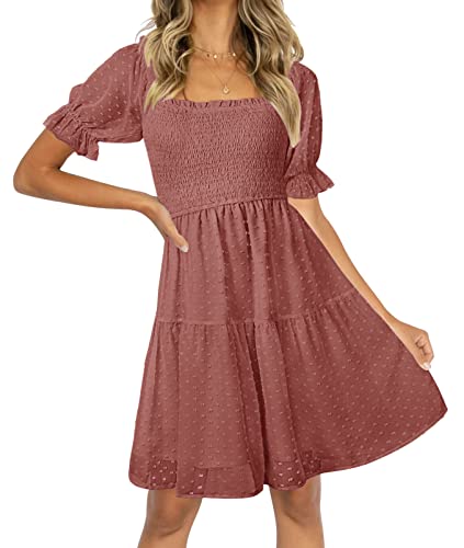 Unique design: Swiss dot print mini dress for women features square neckline, sexy off-the-shoulder, cute puff short sleeve, shirred elastic bust, solid color, tiered dress, pom pom detail, boho chiffon mini dress.