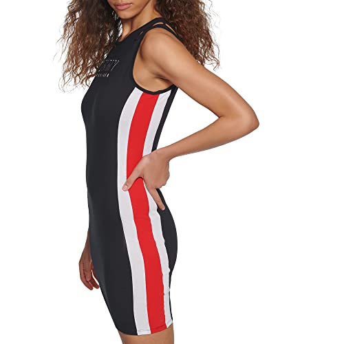 This Tommy Hilfiger womens Sport Dress is a bodycon fit tank dress shoulder cutout side panel color blocking chest graphic