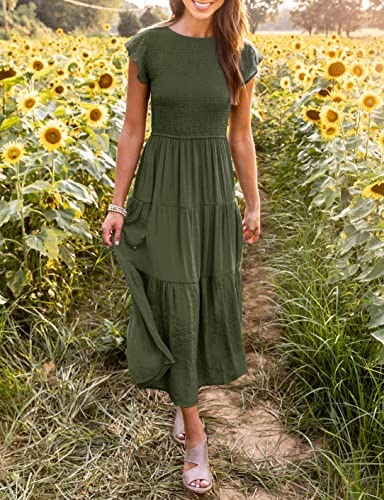 This bold and breezy midi dress has a flattering elastic shirred top, features a crew neck, solid color, high waist, short cap sleeves, edged with playful frills at shoulder, back key-hole closure and a flowy tiered midi skirt, adds more feminine.