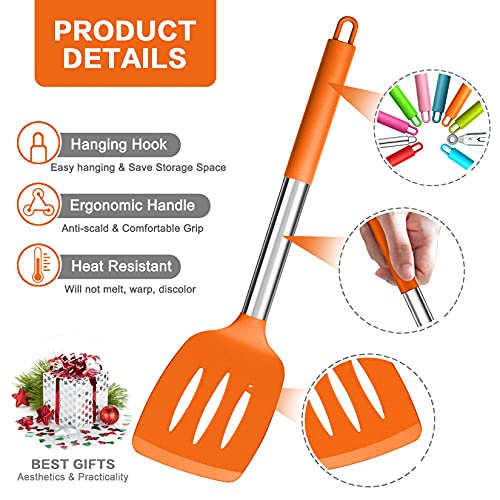 【EASY USE】 Sturdy handle wrapped in velvety silicone for heat and skid proof grasp, Smooth edge without sharp angles, Prevent cutting you hand, All the utensils are dishwasher safe, Non-stick and stain-resistant attributes make hand-wash in a breeze Big holes at the end of the handles for easily hanging on the kitchen wall