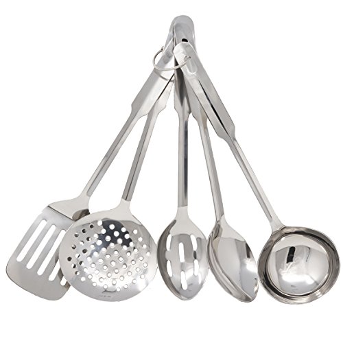 Amco stainless steel 5 piece utensil/kitchen tool setamco housework, an award-winning brand, has been making cooking and cleaning easier since the 1970s. It’s a commitment that’s earned it the love and respect of professional and home cooks around the world. Amco houseworks creates quality, innovative, stylishly designed kitchen tools and accessories that help people enhance the quality of their cooking and entertaining. Amco houseworks uses commercial grade stainless steel to craft its top quality kitchen utensils and accessories. We specialize in combining precision and performance to create stylishly designed premium kitchen tools. Our products are innovative, are intuitive and easy to use for the cooking enthusiast. This Amco basic ingredients 5Piece utensil set is a value and conveniently packaged as a starter set. These tools will cover the basics. The set includes stainless steel: ladleslotted turnerskimmersolid spoonslotted spoonkey features extra long handles making it easier to work with large and deep cookwarehandles are designed to minimize weight while reducing Flex/bendingthese tools can be hung and adds that pop of stainless steel to any kitchen decor make of stainless steel doesnt absorb oils like wood easy clean up/dishwasher safeelminate the plastic tools in your kitchen. This kitchen tool set offers everything you need without compromise in quality and your wallet. A great set for starters but also makes a great addition to the seasoned cook. You can never have too many utensils while cooking