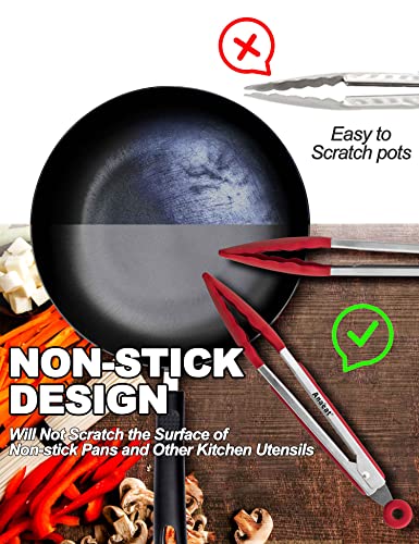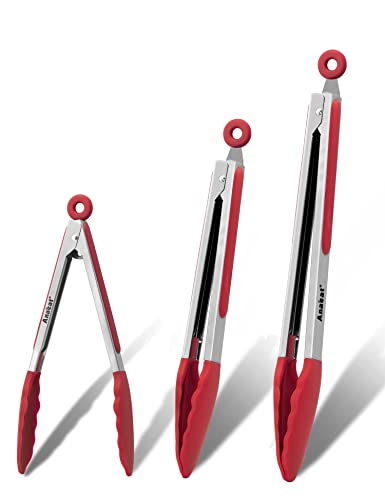 Anaeat Non-Stick Silicone Locking Tong Set of 3 – Stainless Steel 7″, 9″ and 12″ Kitchen Food Tongs with Non-Slip Silicone Tips and Grip for Cooking, Baking and BBQ – Heat Resistant up to 480°F (Red)