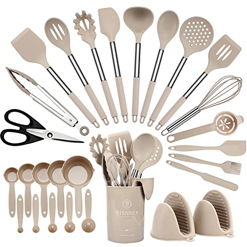 Hvygss Kitchen Utensil Set, 28 Pcs Silicone Cooking Utensils Set, Stainless Steel Handle Silicone Spatula Set with Silicone Whisk, Tongs, Ladle, Scissors, Measuring Cups and Spoons Set (Khaki)
