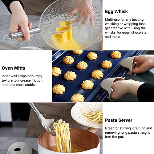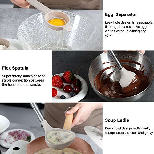 ? 28 DURABLE KITCHEN UTENSILS- We have carefully considered most of the scenarios needed for kitchen use and carefully selected 28 different kitchen utensils to meet your various cooking needs. For example, deep soup, serving spoon, pasta server, flexible pouring brush, mixer, tongs, tumbler, silicone spatula oven mitt, egg separator.