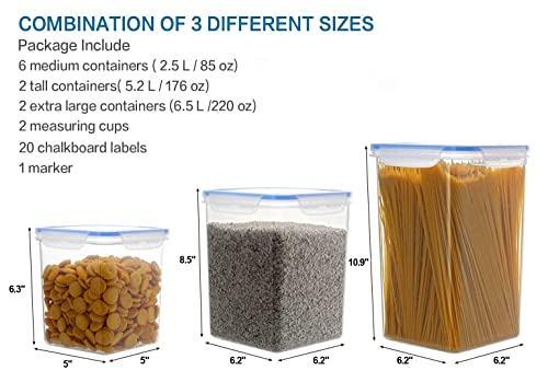 PERFECT FOR DIFFERENT STORAGE – Our food storage container set comes with 10 containers of 3 different sizes, making it a must-have in the kitchen. It includes 2 extra large containers (6.5 L / 220 oz), 2 tall containers( 5.2 L / 176 oz), 6 medium containers ( 2.5 L / 85 oz), 2 measuring cups, 20 labels and 1 marker.
