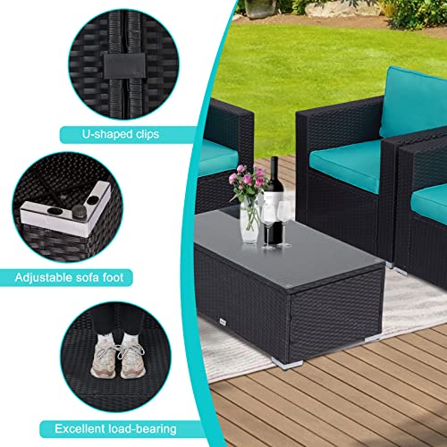 J-SUN-7 Patio Furniture PE Wicker Furniture Set – 4 Pieces Outdoor Brown Rattan Sectional Conversation Sofa with Storage Box Table and Blue Cushions