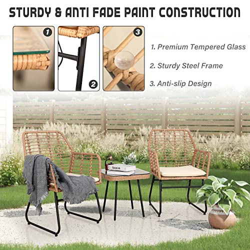 STURDY & DURABLE: These wicker patio chairs are constructed with sturdy frame, which provides durable and bearing ability. The 3 piece patio set covered with high strength PE wicker, which can withstand changes in weather. Thickened water resistant durable cushions and tempered glass are easy to clean.