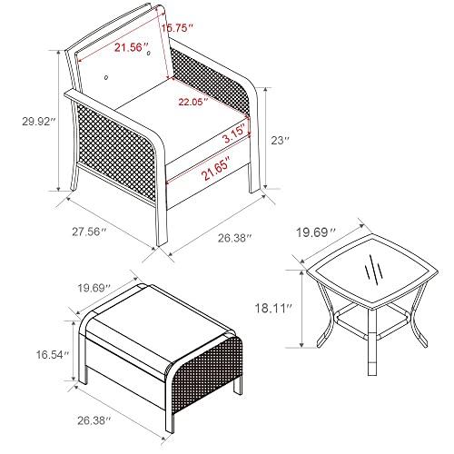 【Dimension】 Single Sofa (A): 26”W x 30”H x 28”L; Seat Cushion: 22”W x 3.2”H x 22”L; Back Cushion: 15.8” H x 21.6”W; Ottoman(B): 19.7” W x 16.5” H x 26.4” L; Coffee Table(C): 37”W x 22”H x 18”L. Notice: This set ships with two packages, and any damage caused by shipping, feel free to contact us, we will ship a free replacement.