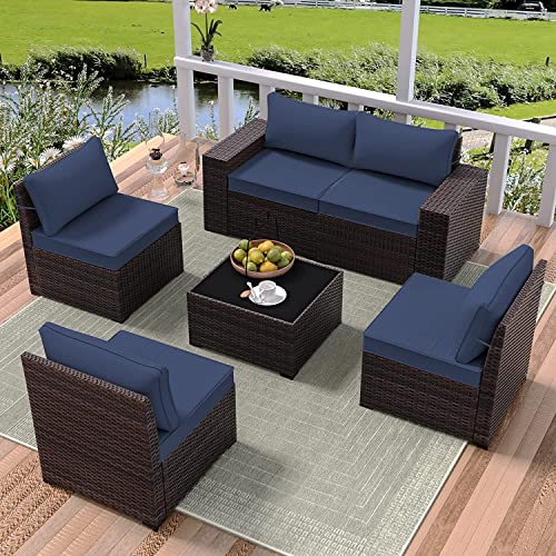 RTDTD Outdoor Patio Furniture Set, 6 Pieces Outdoor Furniture All Weather Patio Sectional Sofa PE Wicker Modular Conversation Sets with Coffee Table,5 Chairs & Seat Clips (Dark Blue)