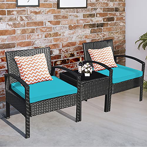 Toolsempire 3 Pieces Patio Conversation Set, Outdoor Wicker Furniture Set with Water-Resistant Cushion & Tempered Glass Top Table, Rattan Chair Bistro Set for Garden, Blacony, Backyard (Turquoise)