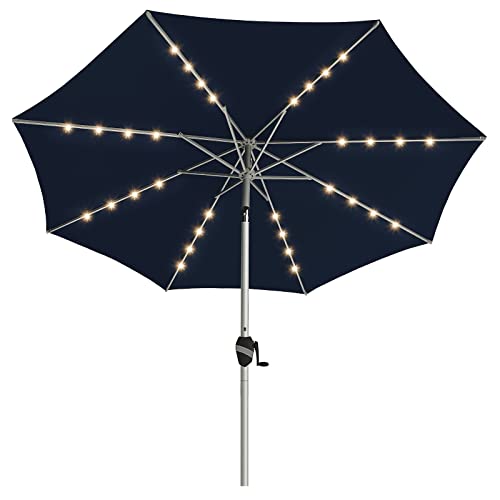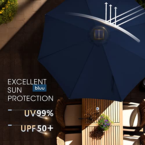 BLUU 9 Ft Patio Umbrella with Solar LED Lights, 5-YEAR Fade-Resistant Aluminum Outdoor Table Umbrella with Tilt Adjustment and Crank for Pool, Deck, Garden and Lawn (Navy Blue)