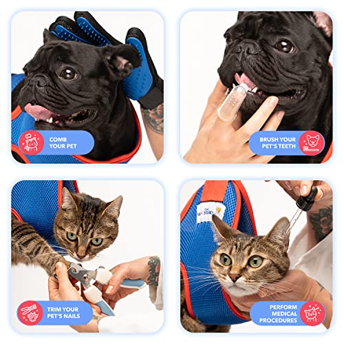 The dog restraint for nail clipping and cat restraint for nail clipping is perfect for professional groomer salons. The dog hammock for grooming comes with distracting licking mats, clippers, a file, a clipper, a glove, and more stuff for a great session. It’s also a great cat sling for nail trimming.