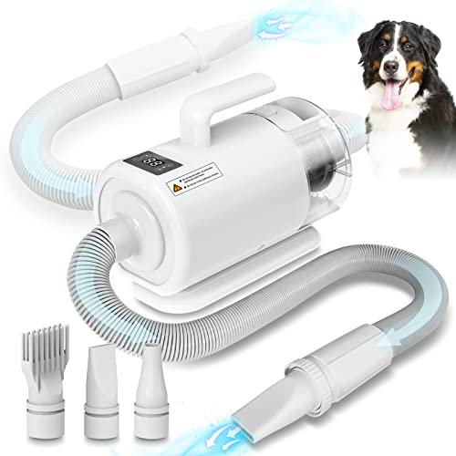 【2 in1 Dog Dryer & Pet Grooming Vacuum】 When the hose is connected to the blowing port, it can be a powerful dog hair dryer that provides enough power to quickly dry your dog’s hair after a bath, a great time saver. When the hose is connected to the suction port, it can become a dog grooming vacuum machine that easily cleans and collects hair from clothes, beds, sofas and corners, etc. powerful suction power is equivalent to a mini vacuum cleaner. Get two for the price of one machine.