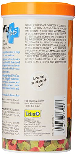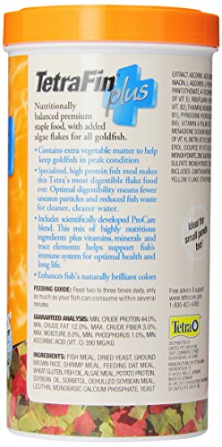 TetraFin Plus Goldfish Flakes offer premium nutrition to your goldfish. Extra vegetable matter helps keep goldfish in peak condition, and specialized, high protein fish meal makes these flakes among Tetra’s most digestible flake food ever. Optimal digestibility means fewer uneaten particles and reduced fish waste for cleaner, clearer water. These tasty flakes include Tetra’s patented ProCare blend that contains a mix of highly nutritious ingredients plus vitamins, minerals, and trace elements that support immune system health and promote long life. TetraFin Plus works to enhance the naturally brilliant colors of your goldfish.