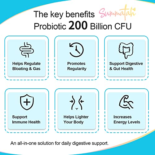 200 Billion CFUs Probiotics High Potency for Max Results: Not 50 or 60 Billion Cfus, our Summatah contains 200 Billion Cfus probiotic per serving daily. Powerful Strength Probiotic for Women and Men. Summatah probiotics provide you with a best probiotic supplement for your Digestive & Gut health, Gas & Bloating, and Immune support.