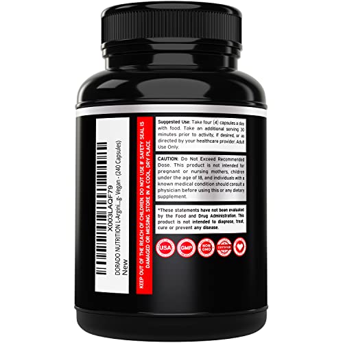 WORKOUT ENDURANCE & PERFORMANCE: Dorado’s L Arginine L Citrulline Complex will push your exercise to a new level. The strong combination of the L-Arginine, L Citrulline and Nitrosigine work synergistically to increase nitric oxide production, bring you strong muscular pumps and endurance, and delay fatigue in the gym.