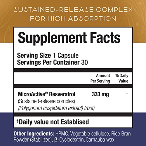 THE AGE-DEFYING RESVERATROL for 250% BETTER ABSORPTION. Many resveratrol supplements are DIFFICULT TO ABSORB by our body because they are formulated with regular 98% resveratrol, WHICH ISN’T BIOAVAILABLE. Bioavailability is the amount of resveratrol that gets absorbed into your body & can be used by your cells. Our formula with MicroActive resveratrol is a 12-HOUR SUSTAINED RELEASE COMPLEX. The complex gradually RELEASES RESVERATROL OVER 12 HOURS, making it LAST LONGER & 250% more bioavailable.
