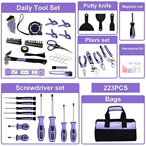Purple Tool Set,ACOSEA 223-Piece Tool Sets for Women,Tool Kit with 13-Inch Wide Mouth Open Purple Tool Bag,The Basic Tool Set is Perfect for Home Maintenance (PURPLE)