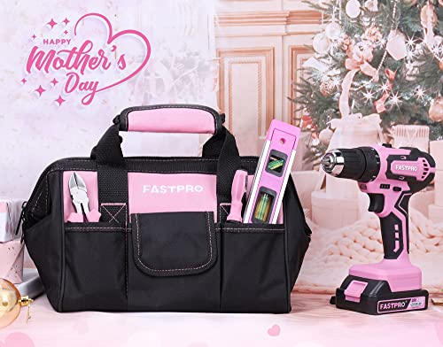 FASTPRO 232-Piece 20V Pink Cordless Lithium-ion Drill Driver and Home Tool Set, Lady’s Home Repairing Tool Kit with 12-Inch Wide Mouth Open Storage Tool Bag