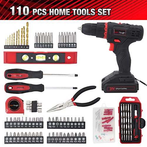A universal home tool kit,including all daily tools like drill bits,sockets,screwdrivers,tape measure,plier,level,etc., all are well organized in deluxe tool case.With adding of 20v cordless drill,make this set more value.